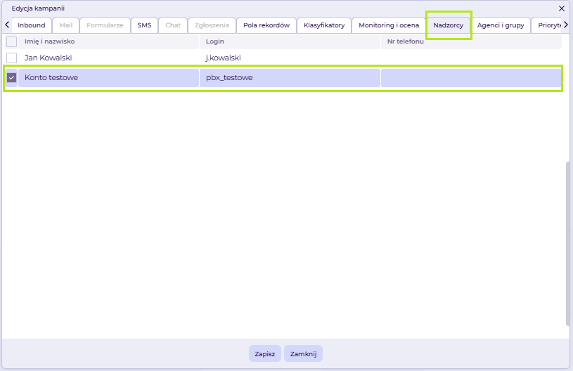 W kolejnym kroku przejdź do zakładki „Nadzorcy” i wybierz nadzorcę, który będzie miał dostęp do monitorowania tworzonej kampanii.