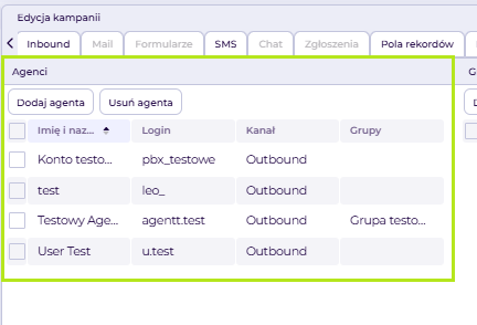 Do tworzonej kampanii przypisz agentów. Kliknij przycisk Wybierz. Dodanego agenta można usunąć klikając przycisk Usuń agenta