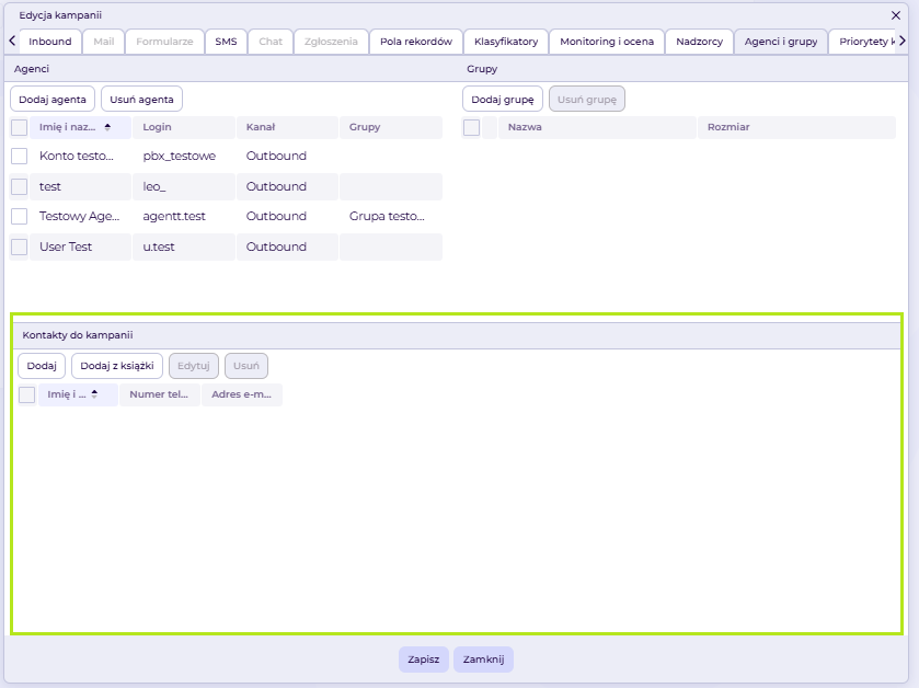 Drugie okno - Grupy - pozwala na dodanie do kampanii zespołu agentów. Aby to zrobić należy kliknąć przycisk Dodaj Grupę.