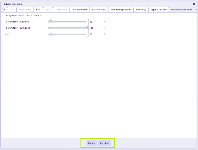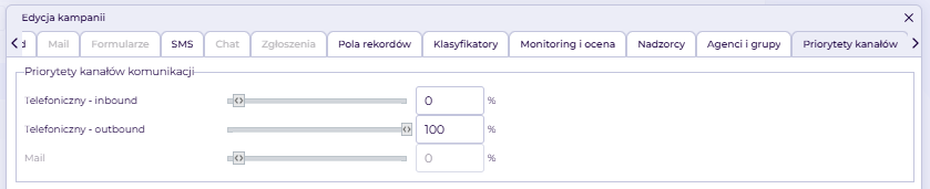 Zakładka Priorytety kanałów służy do ustawienia priorytetu, z jakim system będzie traktował interakcje z poszczególnych kanałów komunikacji. Przesuń suwakiem i ustal priorytety.