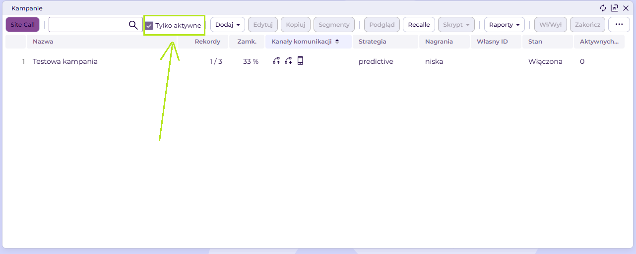 Nowo utworzona kampania pojawiła się na liście wszystkich zdefiniowanych ze statusem kampanii nieaktywnej - kampania jest wyszarzona ( Prawy górny róg okna – Tylko aktywne). Kliknij w tę pozycję aby wyświetlić wszystkie kampanie.