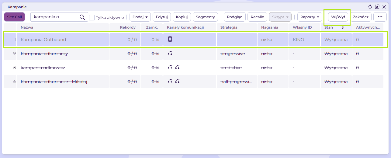 W celu włączenia kampanii należy zaznaczyć na liście wybraną kampanię, a następnie na pasku menu kliknąć przycisk (Włącz/ Wyłącz). Kampania widoczna jest na liście jako czarna.