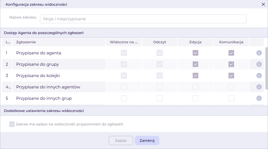 Widoczność zgłoszeń to nowy system nadawania uprawnień dostępu do zgłoszeń. Polega on natworzeniu zakresów, w których administrator może definiować uprawnienia, a następnie przypisywać je agentom. Dostępne są 4 poziomy uprawnień: widoczne na liście, odczyt, edycja i komunikacja. Przygotowane zakresy można wykorzystywać we wszystkich utworzonych kampaniach DESK.
