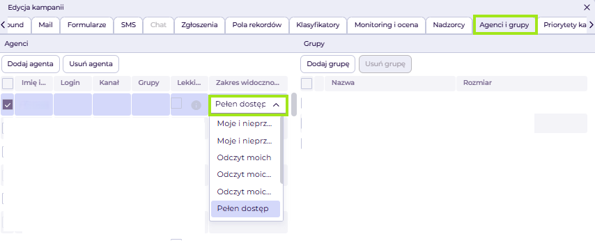 W zakładce agenci i grupy dostępna jest lista wszystkich agentów pracujących w kampanii. W kolumnie zakres widoczności dostępna jest lista, z której wybieramy zakres widoczności zgłoszeń dla danego agenta.