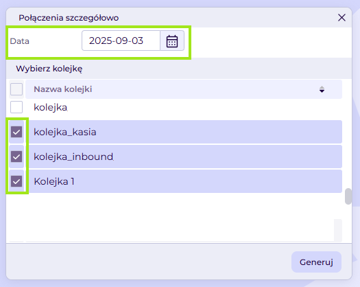 - kolejki, których raport ma dotyczyć (można wybrać kilka kolejek),