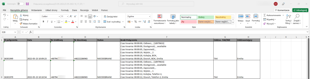Raportowanie > Moje raporty > Połączenia szczegółowo