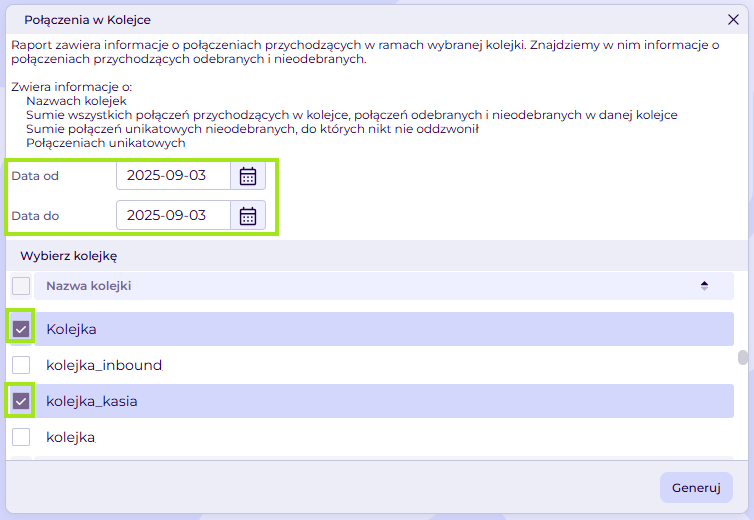 Tak, można wybrać kilka kolejek – raport pokaże dane dla każdej z nich.