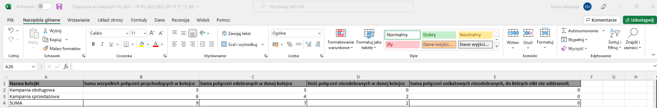 📌Wartości w kolumnach mogą być liczone w różny sposób – liczba połączeń przychodzących jest liczona jako unikalne połączenia, natomiast liczba połączeń nieodebranych jako liczba prób obsługi połączenia w kolejce.