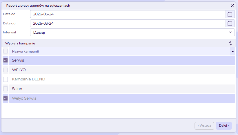 Po ustawieniu filtrów klikamy Dalej, a następnie wybieramy agentów, dla których raport ma zostać wygenerowany.