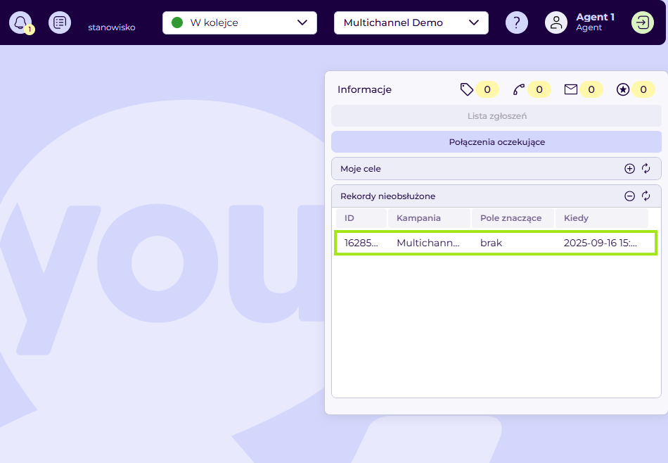 Rekord nieobsłużony to taki, którego agent nie zdążył zamknąć (podsumować) w czasie WRAP, czyli np. zakończyć pracy ze zgłoszeniem lub nadać klasyfikatora . Rekord taki spada na listę Rekordów nieobsłużonych. Celem zamknięcia takiego nieobsłużonego rekordu z poziomu panelu Agenta wybieramy rekord z listy w obszarze Rekordy Nieobsłużone