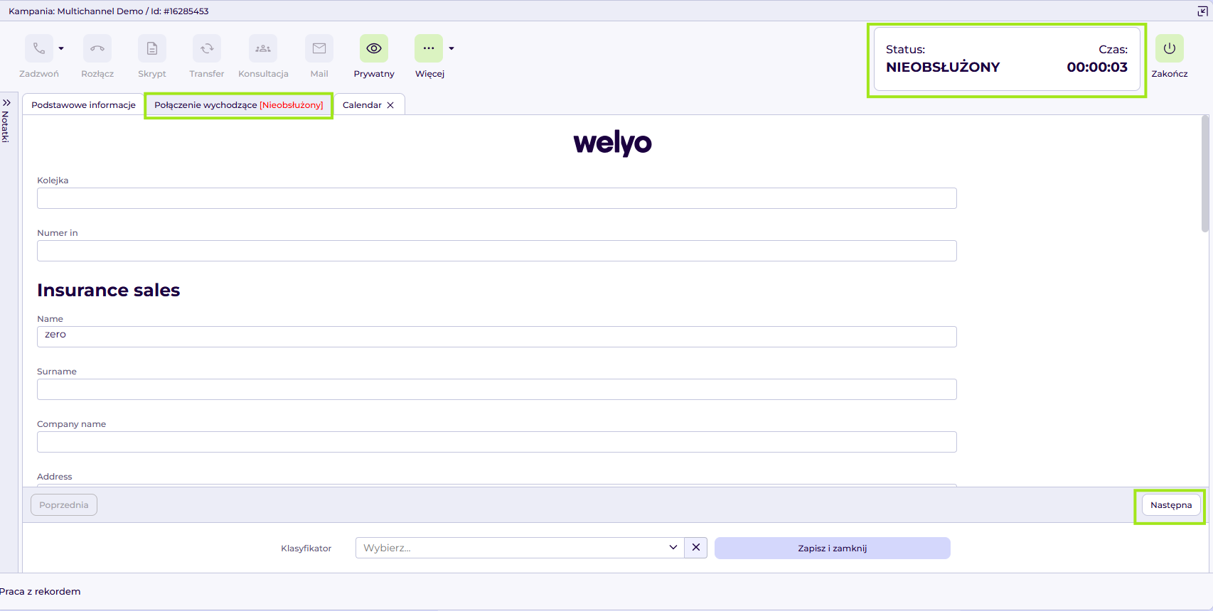 WAŻNE! Na rekordzie nieobsłużonym nie ma możliwości wykonania połączenia wychodzącego.