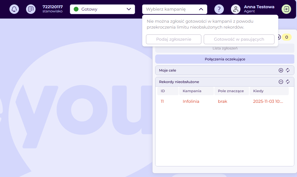 Jeśli agent przekroczy limit dozwolonych nieobsłużonych rekordów w kampanii, jego gotowość w tej kampanii zostaje automatycznie zdjęta, a na konto nakładana jest blokada obowiązująca do momentu obsłużenia zaległych rekordów. W tym czasie agent nie może zgłosić gotowości w żadnej z kampanii.