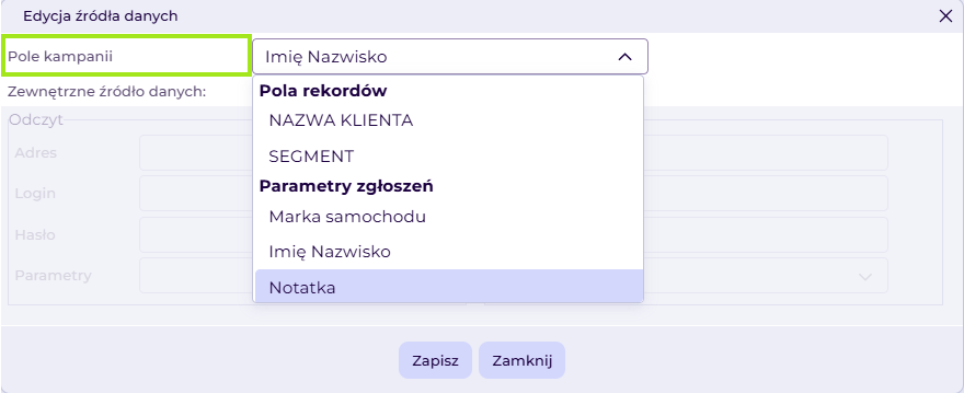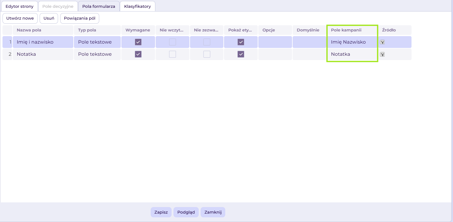 Po wybraniu pola, klikamy Zapisz. W kolumnie Pole kampanii zobaczymy informacje do jakiego pola kampanii przypisane jest pole rekordu.