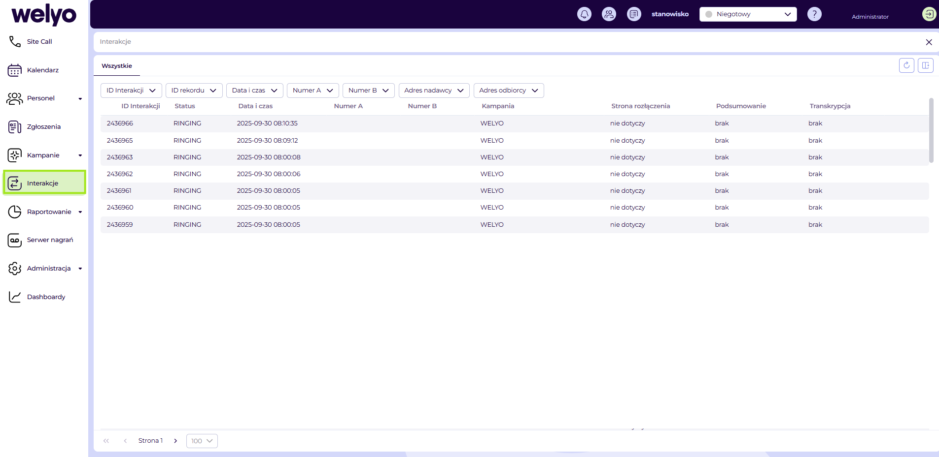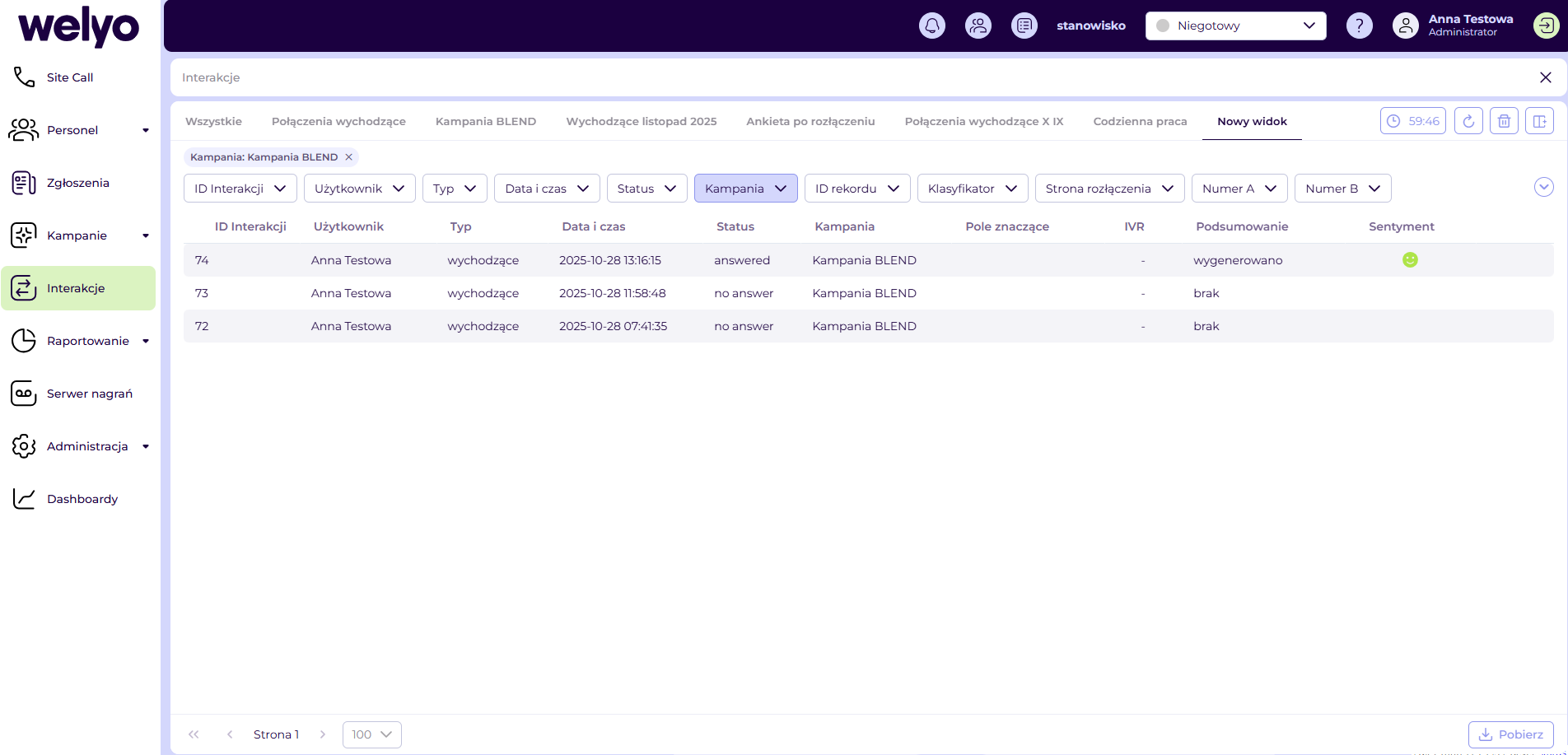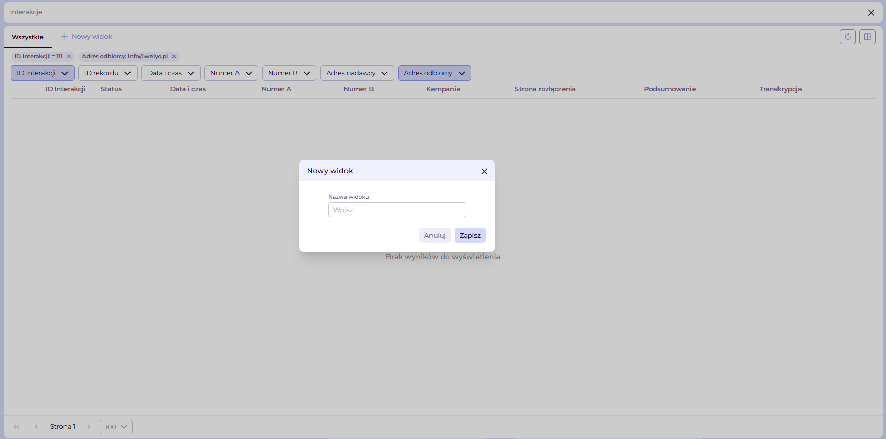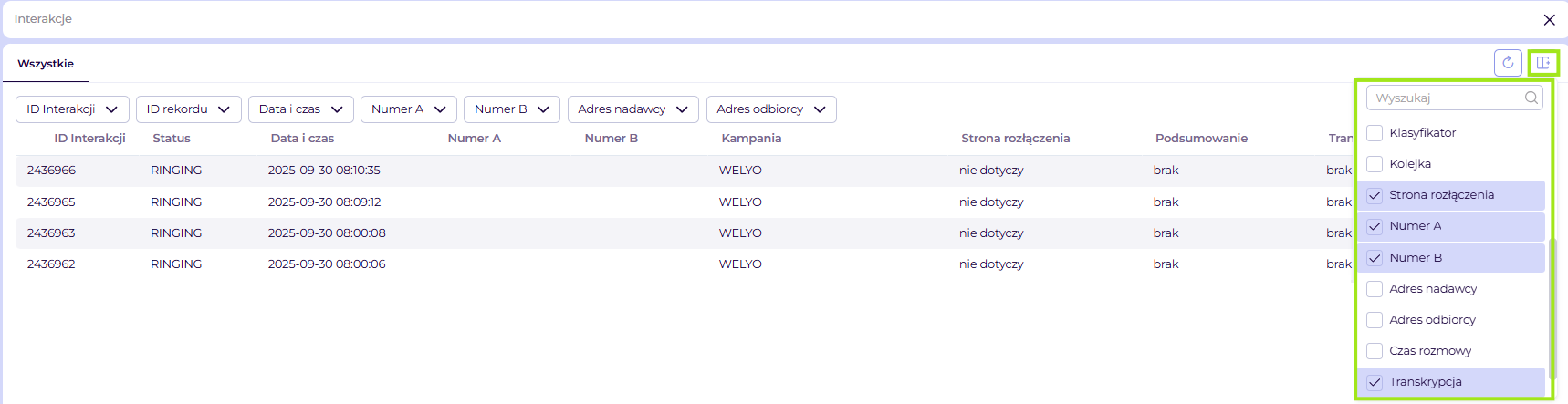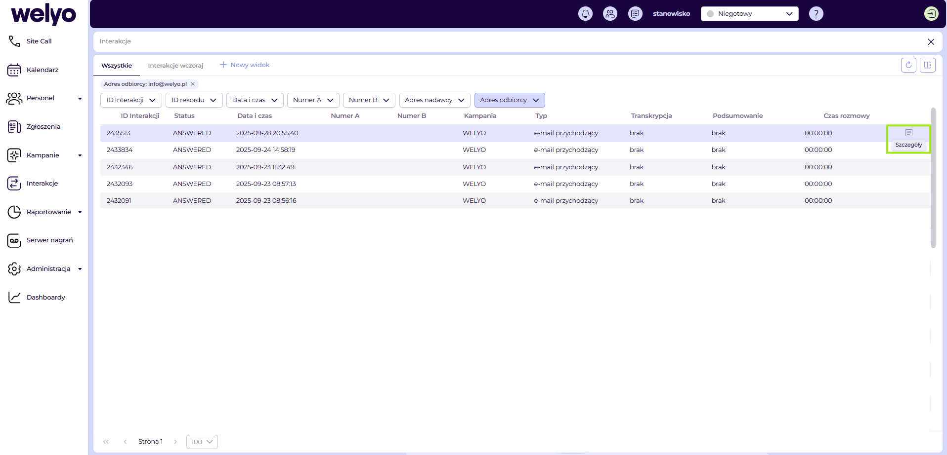 Nowy widok Interakcje to przejrzyste okno na platformie Welyo, w którym w jednym miejscu zebrane są wszystkie połączenia, wiadomości, chaty i maile. Umożliwia szybkie przeglądanie, filtrowanie i dopasowanie kolumn do własnych potrzeb. Dzięki temu użytkownik może skupić się na najważniejszych informacjach.