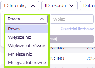 Po kliknięciu w filtr możliwe jest wybranie, jakie ID chcemy wyszukać, nie ograniczamy się już tylko do wyszukiwania konkretnych ID, ale możliwe jest wybranie opcji Większe niż, Większe lub równe, Mniejsze niż, Mniejsze lub równe i oczywiście Równe