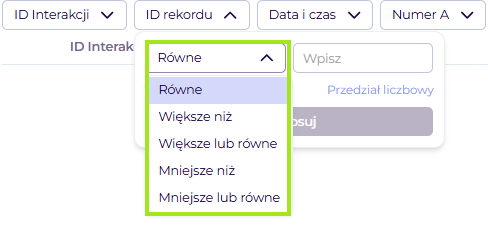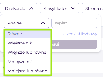 Po kliknięciu w filtr możliwe jest wybranie w jaki sposób chcemy wyszukiwać wpisy: