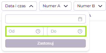 Po kliknięciu w filtr możliwe jest wyszukanie konkretnego numeru telefonu (nie ma konieczności podawania pełnego numeru, wymagane jest podanie minimum 5 cyfr, jeśli numer jest dłuższy system wyszuka wszystkie połączenia z numeru, który zawiera podany przez nas ciąg cyfr)