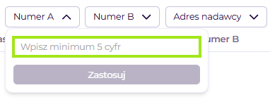 Po kliknięciu w filtr możliwe jest wyszukanie konkretnego numeru telefonu (nie ma konieczności podawania pełnego numeru, wymagane jest podanie minimum 5 cyfr, jeśli numer jest dłuższy system wyszuka wszystkie połączenia na numer, który zawiera podany przez nas ciąg cyfr)
