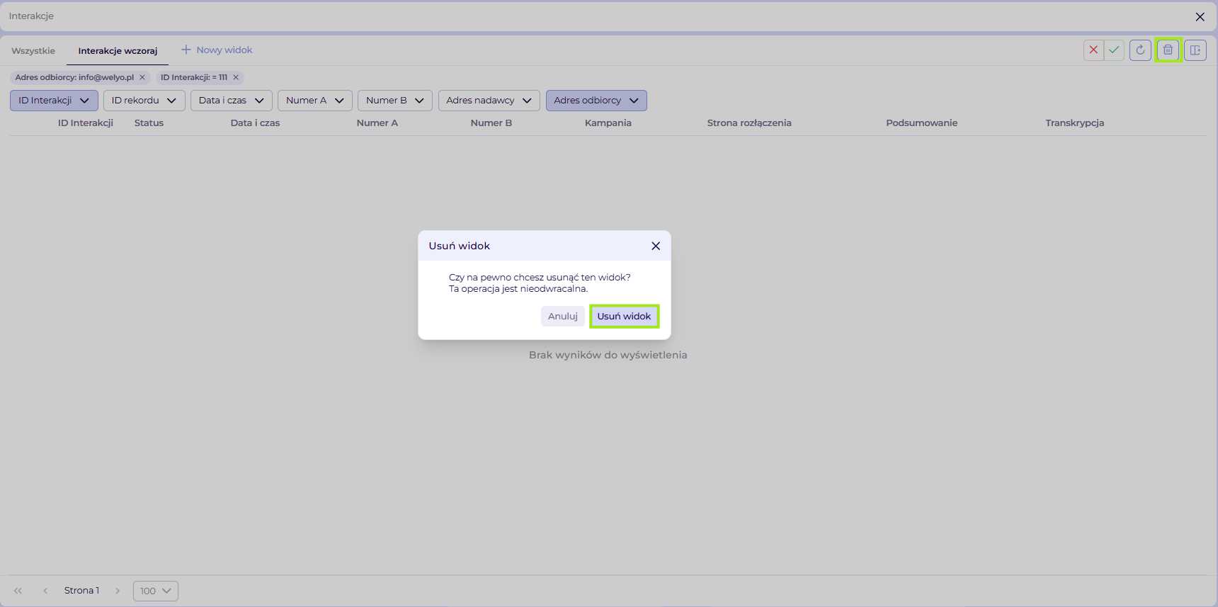 Po wejściu w wybrany widok wybieramy w prawym górnym rogu Usuń (ikona kosza) > Potwierdzamy Usuń widok.