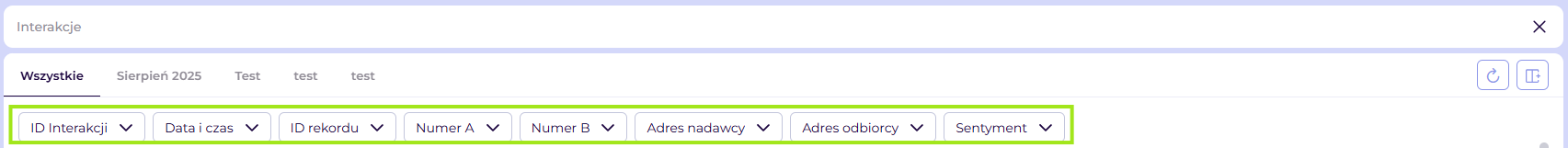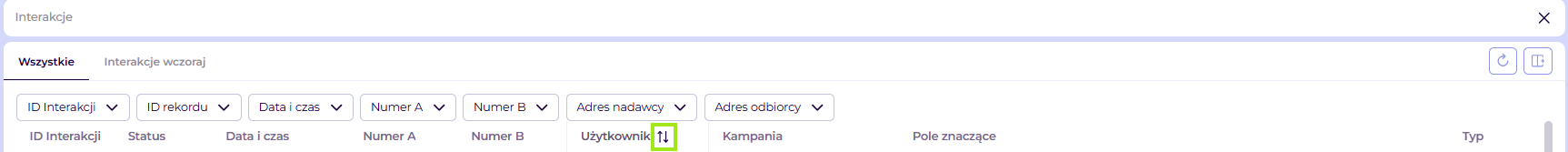 Sortować wpisy możemy poprzez najechanie na tytuł kolumny myszką, po tym pojawi się ikona sortowania (dwie strzałki ↑↓) > po kliknięciu w ikonę lista interakcji zostanie posortowana.