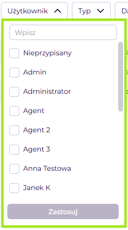 - Użytkownik - umożliwia filtrowanie interakcji według przypisanego agenta. Możliwe jest wybranie kilku agentów jednocześnie. Wybranie opcji Nieprzypisany pokazuje interakcje bez przypisanego agenta.