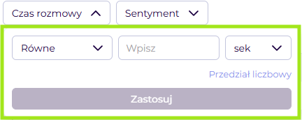 - Czas rozmowy - umożliwia wyszukiwanie według sumy czasu rozmowy Agent – Klient plus czas jaki spędził Klient na schemacie IVR.