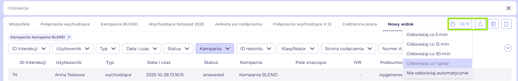 Celem odświeżenia listy interakcji, wybieramy przycisk Odśwież usytuowany na górnej belce po prawej stronie, lub ustawiamy co jaki czas widok ma się odświeżać automatycznie.