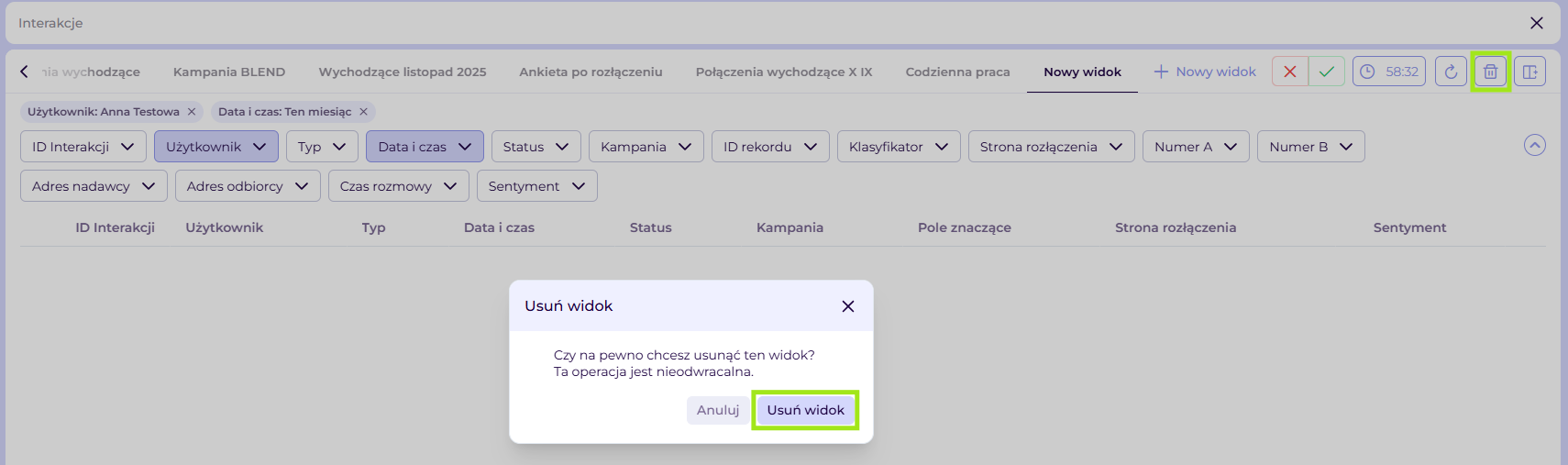 Tak. Usuwanie widoku jest dostępne z poziomu wybranego widoku poprzez ikonę kosza. Po potwierdzeniu widok zostaje trwale usunięty.