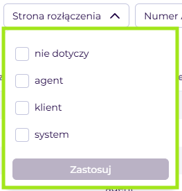- Strona rozłączenia - umożliwia wyszukiwanie według strony, która zakończyła połączenie np. klient rozłączył się (odrzucił połączenie) lub agent zakończył rozmowę, nastąpiło automatyczne rozłączenie przez system.