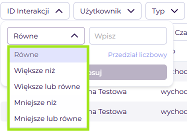 W filtrach możemy wybrać sposób porównania, analogicznie jak w filtrze ID interakcji:
