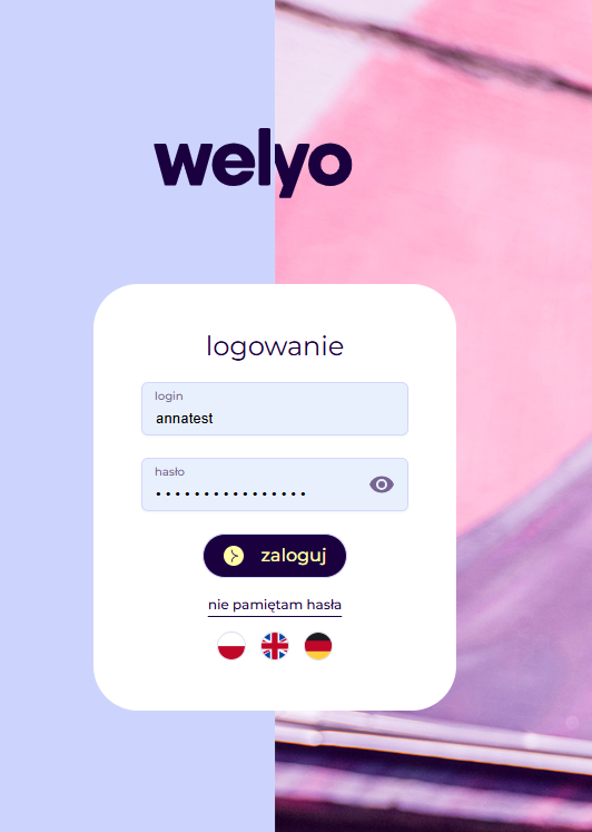 Po wybraniu wersji aplikacja uruchomi się automatycznie i zaloguje Cię na podstawie danych z Welyo.