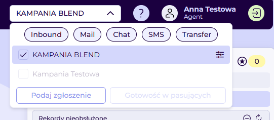 Aby rozpocząć obsługę połączeń, zaznacz checkbox przy wybranej kampanii w panelu agenta FCC.