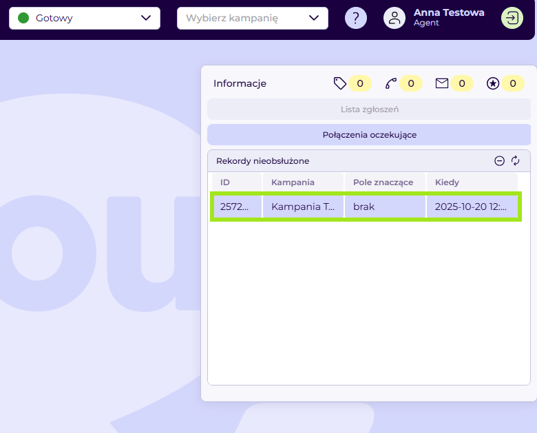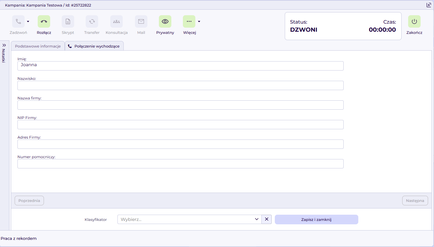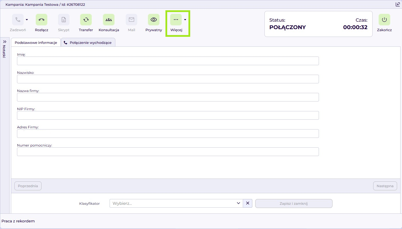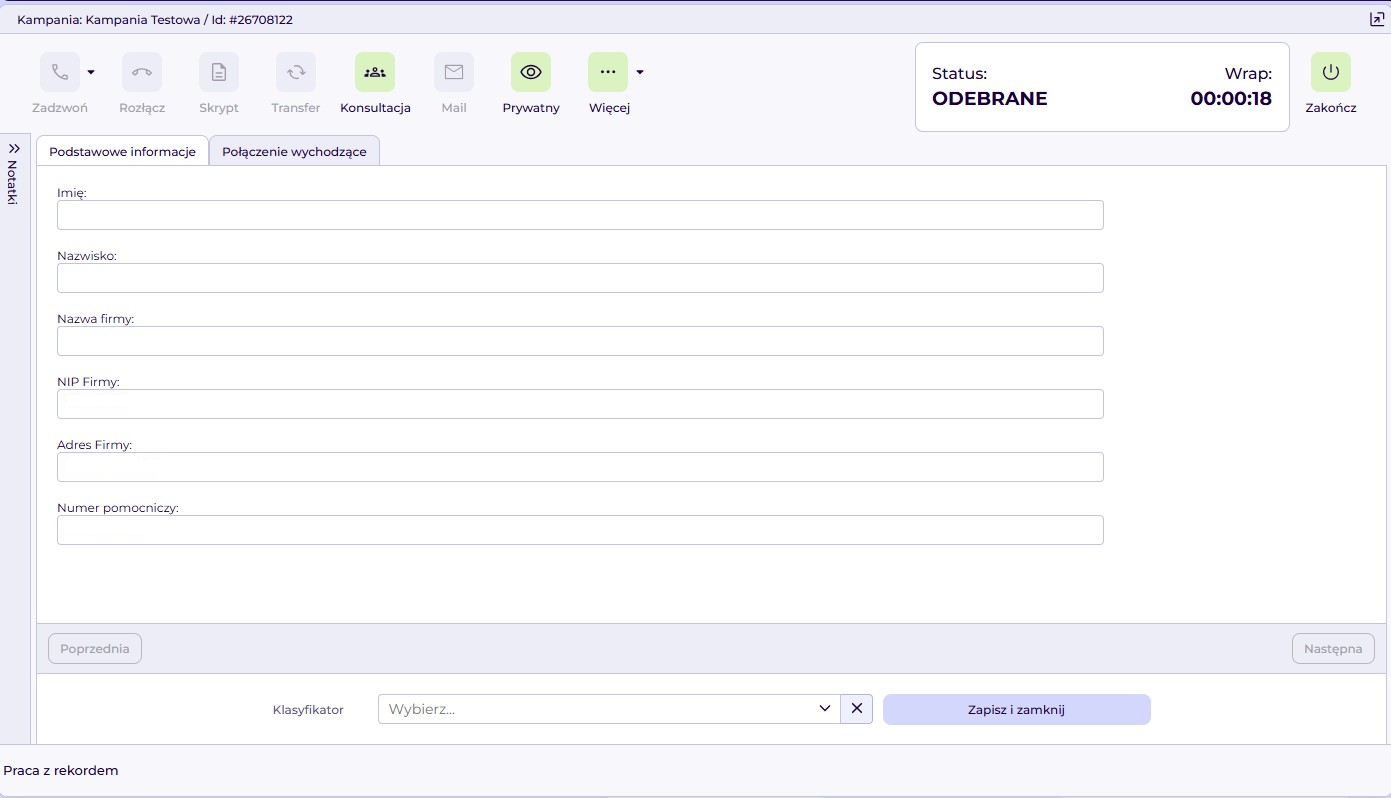Po kliknięciu „Rekordy w kampanii” system otworzy okno rekordu klienta i automatycznie rozpocznie połączenie.