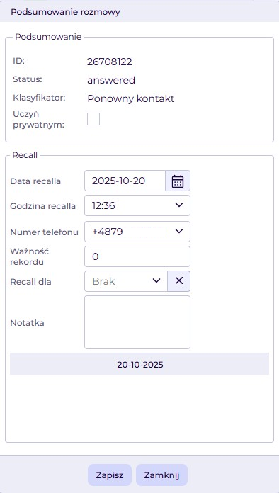 Klasyfikator ponowny kontakt – otwiera okno, w którym można ustawić recalla (czyli oddzwonienie).