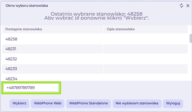 W wyświetlonym oknie wyboru stanowiska wprowadź numer telefonu, z wykorzystaniem którego będą realizowane połączenia i kliknij Wybierz
