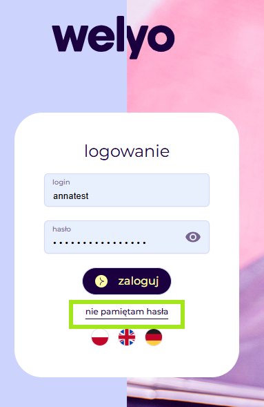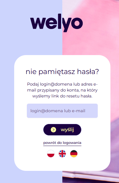 W widoku odzyskiwania hasła możesz podać swój adres mailowy (ten przypisany do konta Welyo) lub podać swój login@domena.