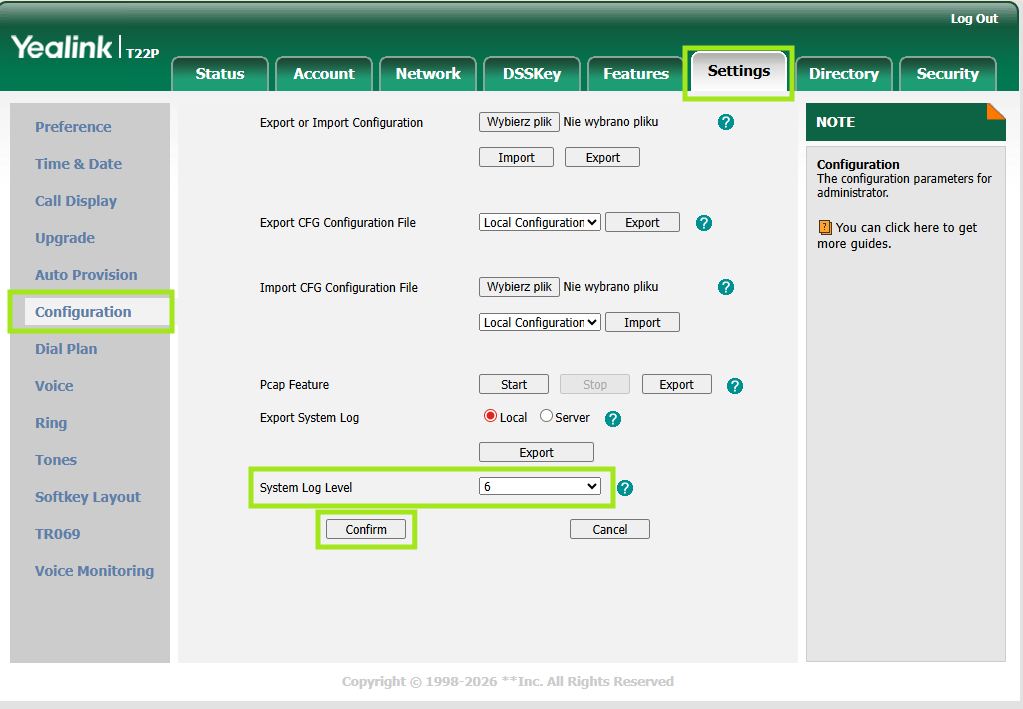 Wykonujemy go w panelu administracyjnym telefonu Yealink.