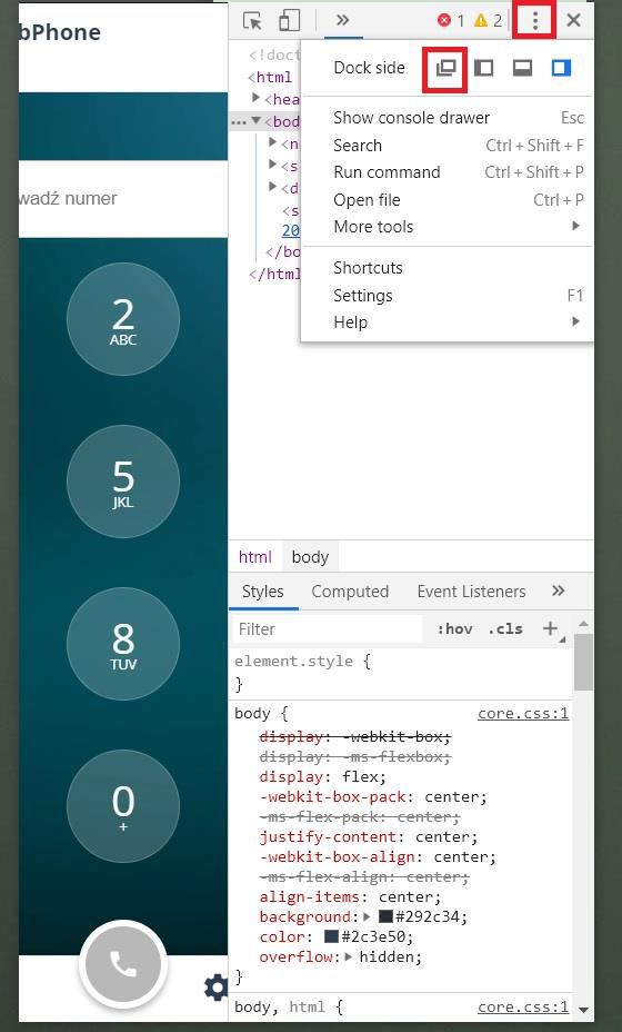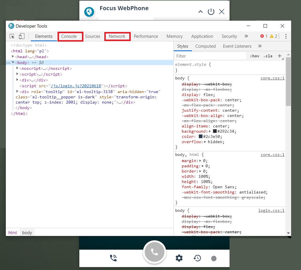 - Po uruchomieniu aplikacji WebPhone na klawiaturze wybieramy jednocześnie Ctrl + Shift + I