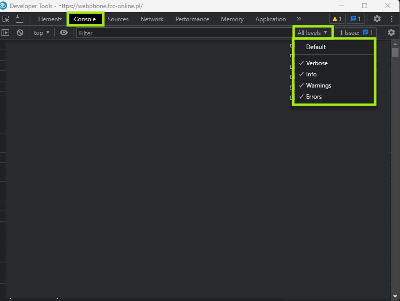 - Po otworzeniu konsoli w nowym oknie, należy kontrolować logi z dwóch zakładek: Console oraz Network.