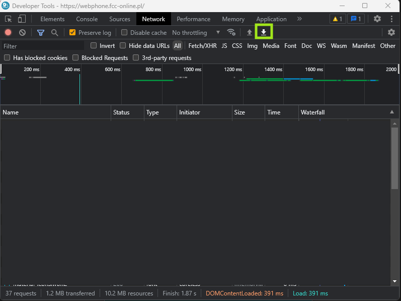 Klikamy w opcję Pobierz HAR (strzałka skierowana w dół)