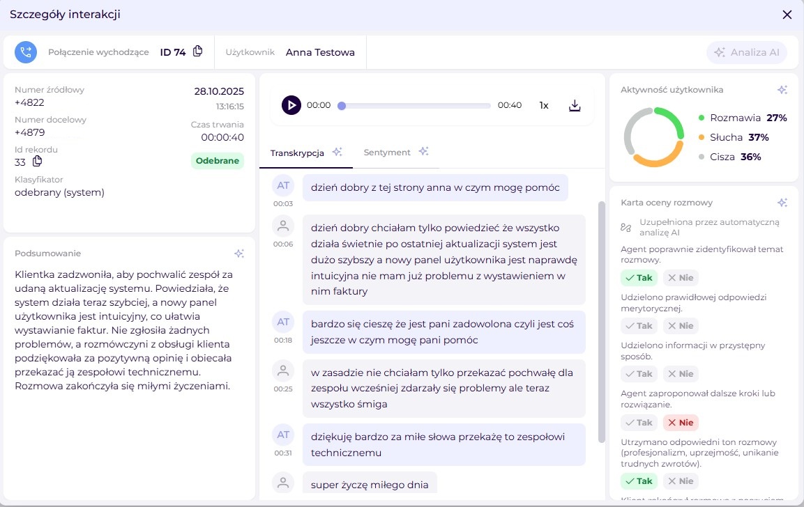 - Karta oceny rozmowy - Na podstawie transkrypcji system automatycznie tworzy kartę oceny rozmowy, w której AI odpowiada na zdefiniowane pytania typu tak/nie (np. czy konsultant przedstawił ofertę, czy rozmowa zakończyła się ustaleniem dalszych kroków). Lista pytań jest konfigurowalna — zmiany można wprowadzić wyłącznie poprzez kontakt z działem Customer Care