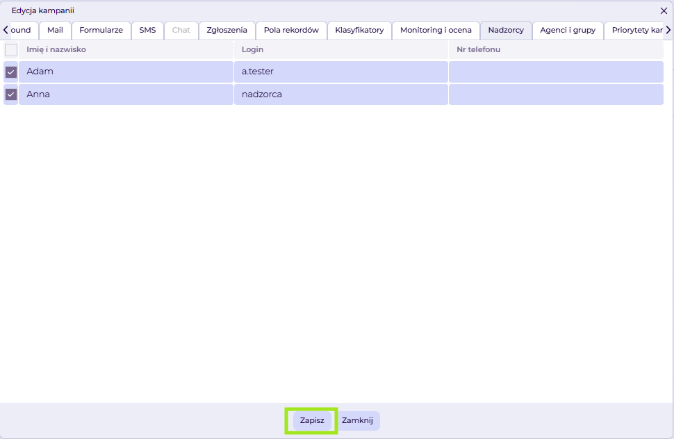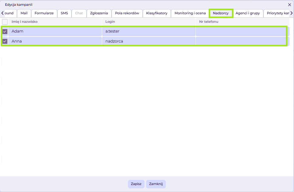W edycji kampanii przechodzimy do zakładki Nadzorcy i zaznaczamy checkbox przy wybranych użytkownikach.