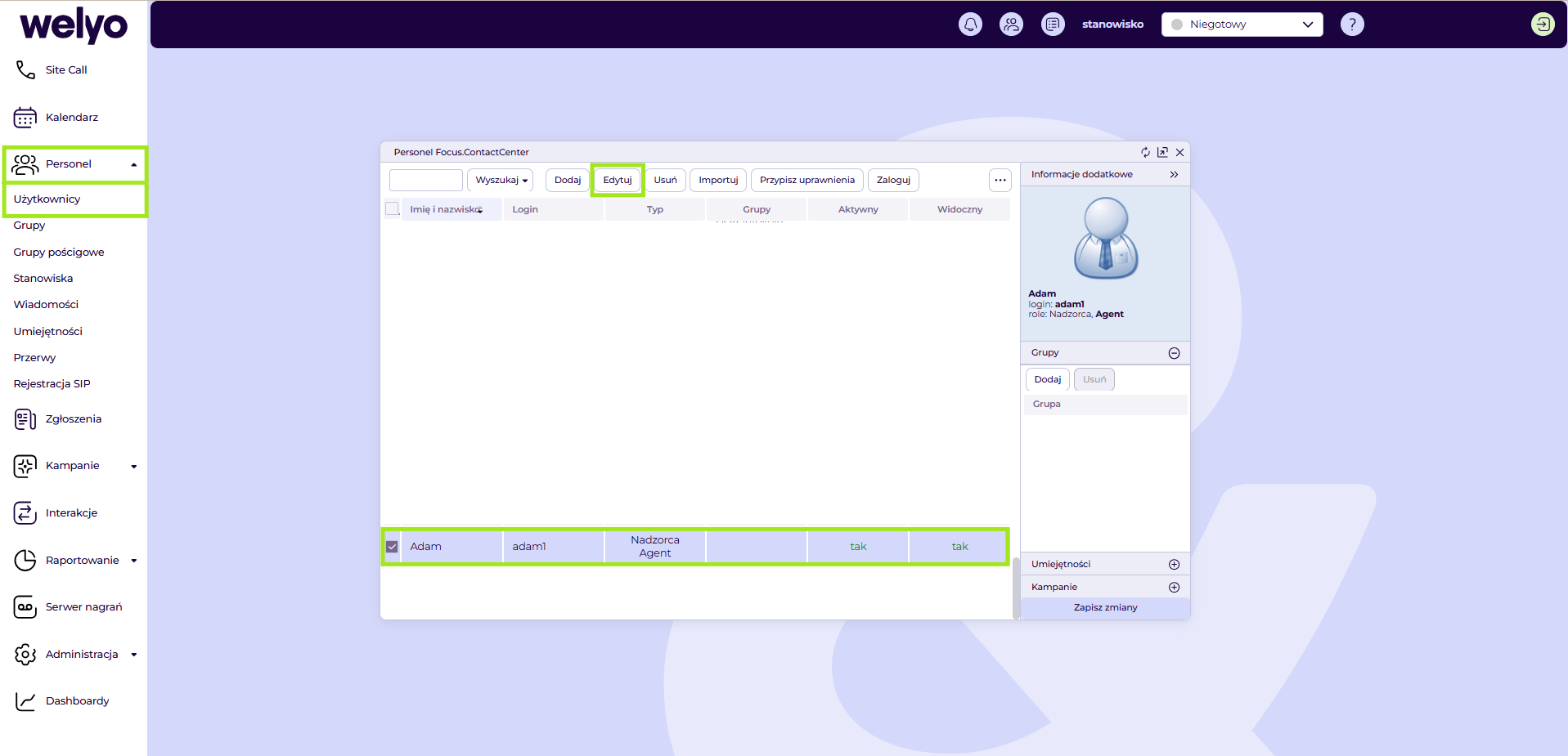 Personel > Użytkownicy > Dodaj/Edytuj > Podstawowe parametry
