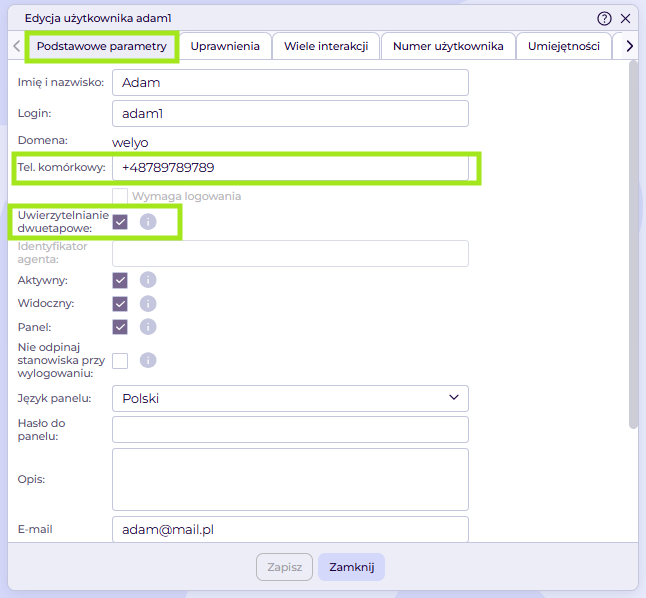 W oknie konfiguracji konta użytkownika dodajemy Tel. komórkowy, na który mają być wysyłane wiadomości SMS z kodem weryfikacyjnym.
