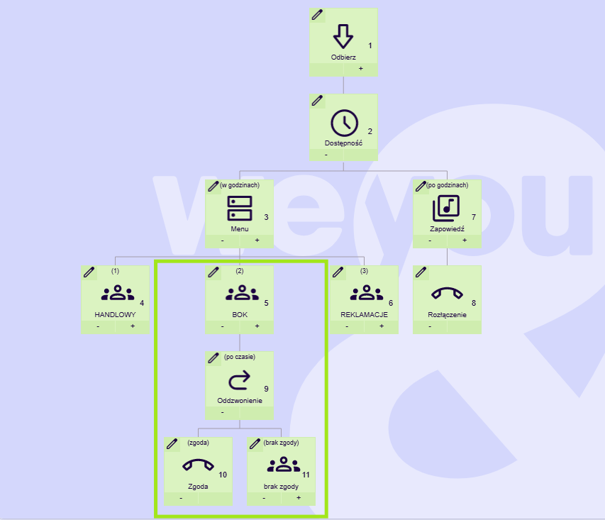 Bloczek Oddzwonienie to element w schemacie IVR, który umożliwia klientowi pozostawienie prośby o oddzwonienie (recall), gdy nie udało się połączyć z agentem podczas połączenia z infolinią.