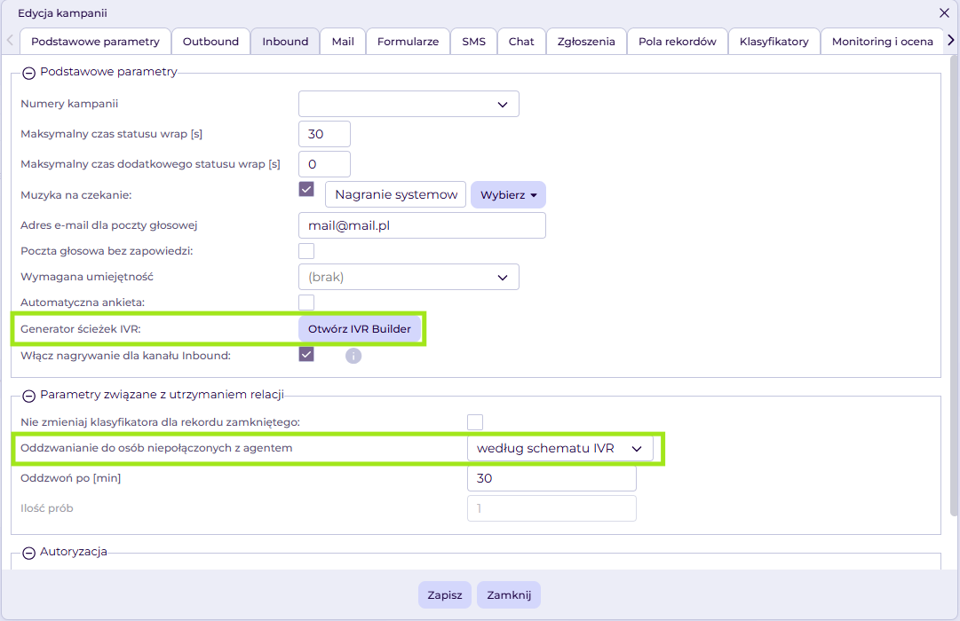 - Przechodzimy do sekcji Parametry powiązane z utrzymaniem relacji w opcji Oddzwonienie do osób niepołączonych z agentem wybieramy opcję według schematu IVR.