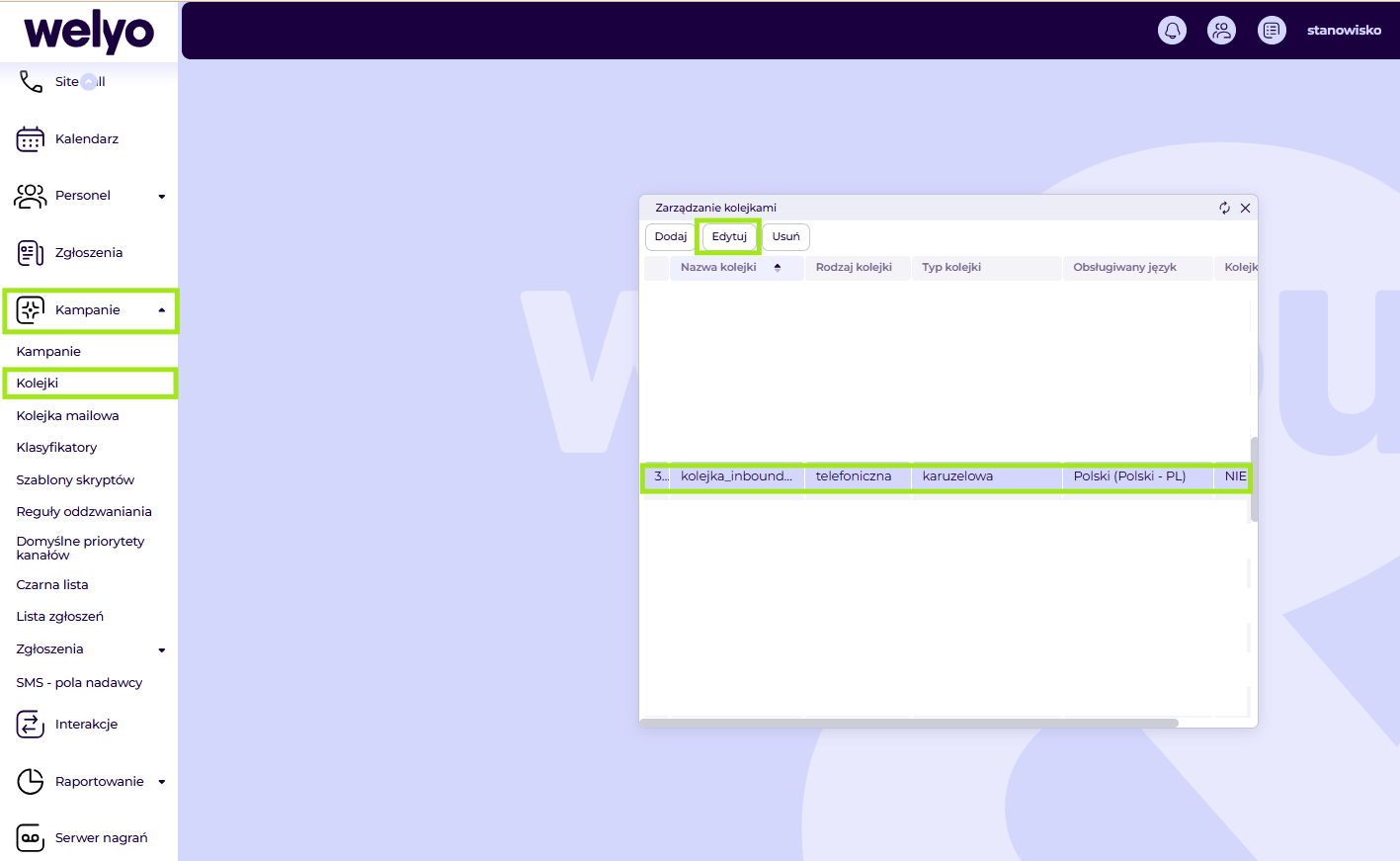 Kampanie > Kolejki > Wybieramy kolejkę telefoniczną > Edytuj