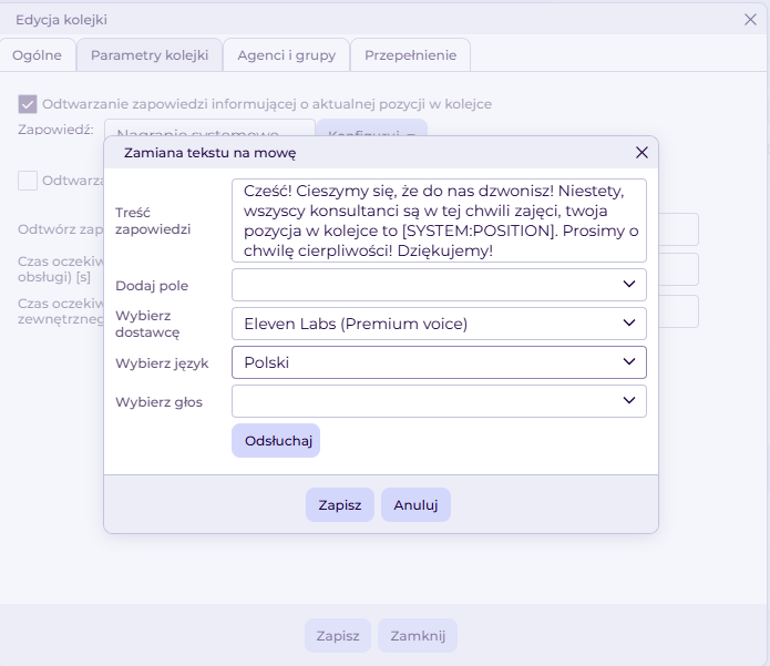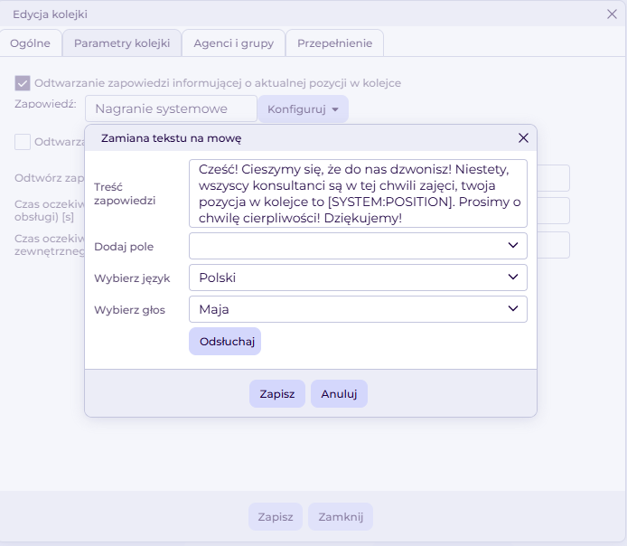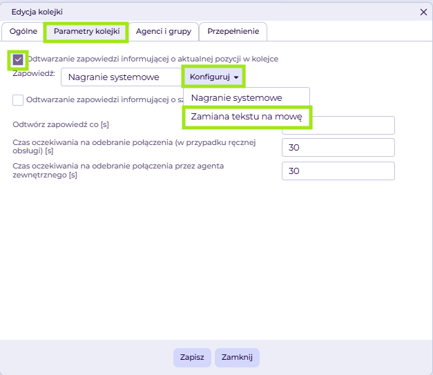 Zakładka Parametry kolejki > Konfiguruj > Zamiana tekstu na mowę