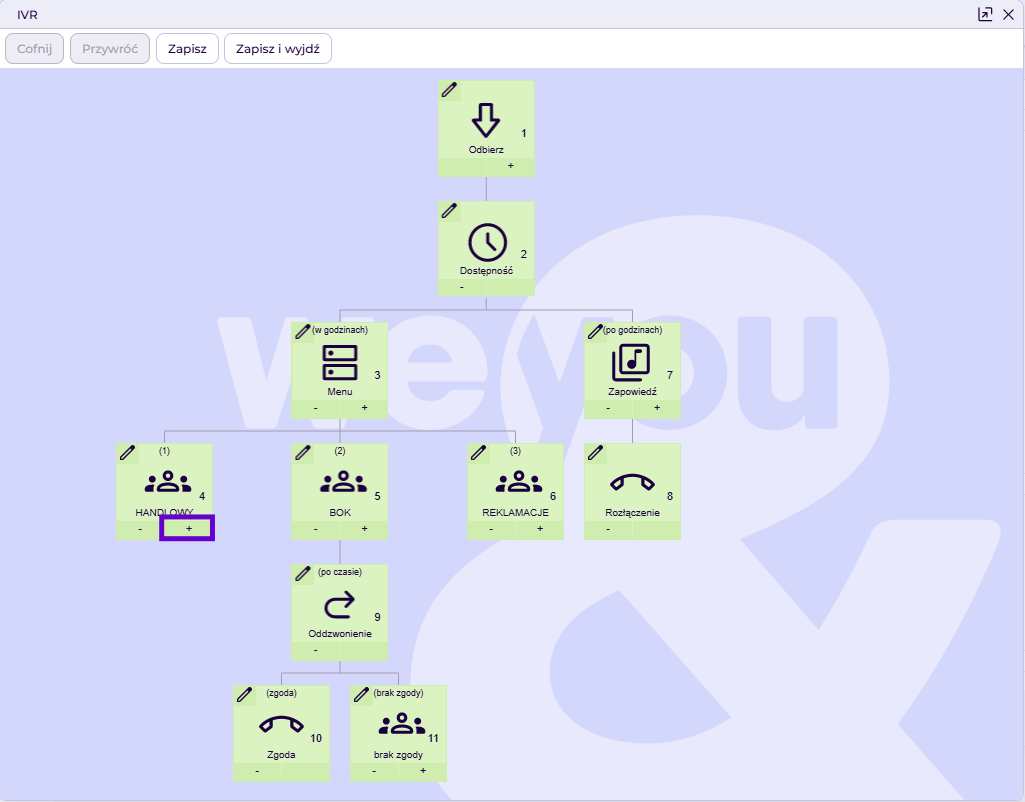 W oknie edycji schematu IVR wybieramy opcję Dodaj (+) by dodać bloczek Zapowiedź