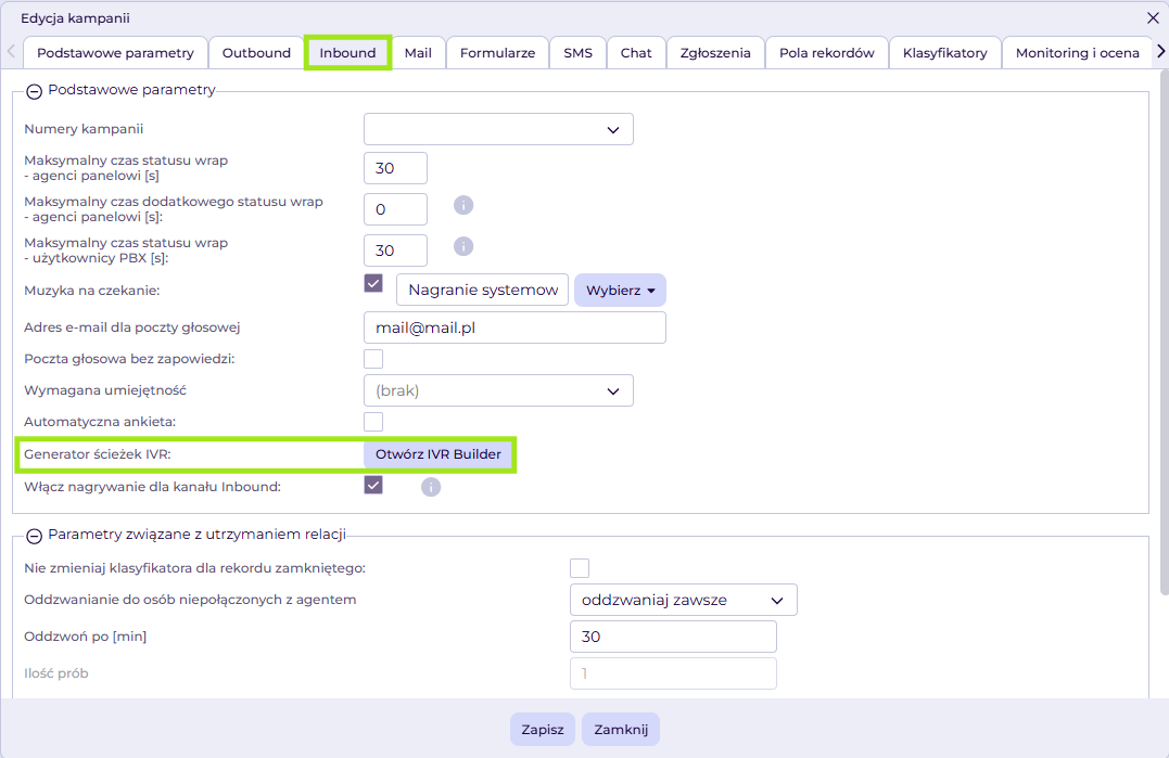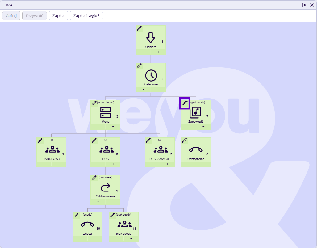 - Po wprowadzeniu zmian zapisujemy schemat IVR oraz ustawienia kampanii.